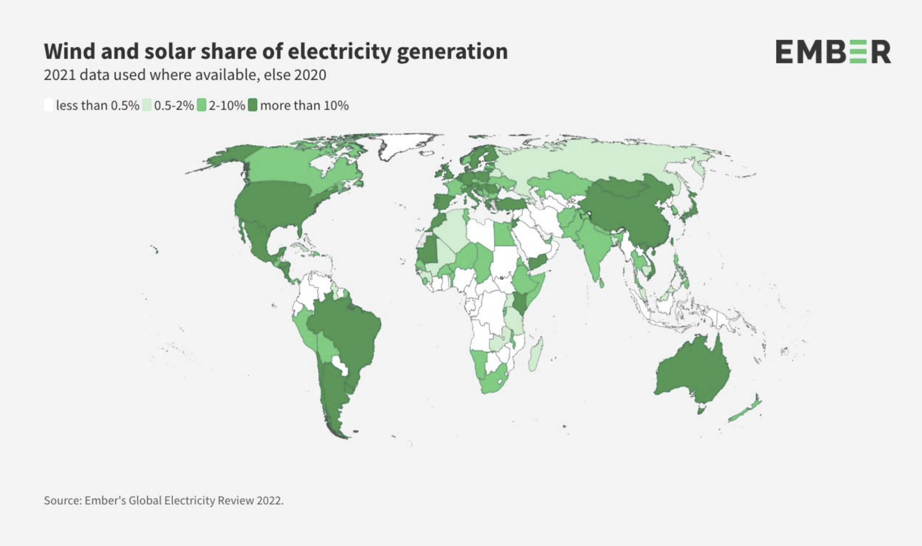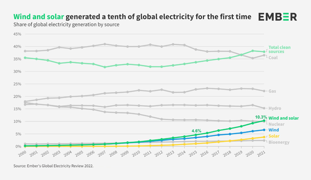 Wind and solar, the fastest growing sources of electricity, reach a record ten percent of global electricity in 2021; all clean power is now 38% of supply.