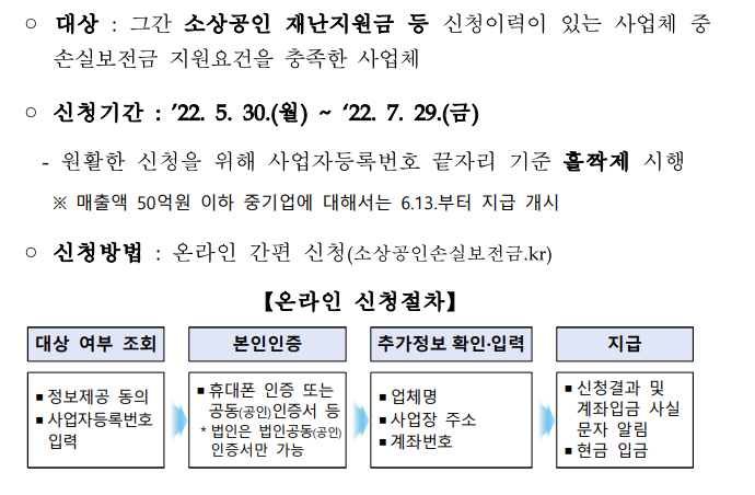 4. 공동 대표 사업체 등 간단한 증빙자료가 필요한 경우, 확인지급('22.6.13일 시작예정)으로 신청이 가능하며 추후 안내할 계획입니다.